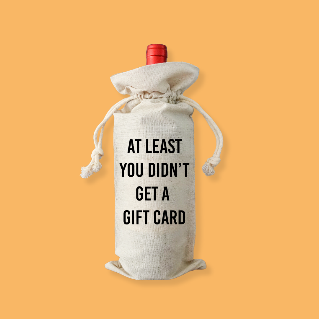 Breng een glimlach op het gezicht van je ontvanger met onze linnen fleszak, bedrukt met de geestige tekst "At Least You Didn't Get a Gift Card"! Dit is de perfecte manier om een fles wijn of likeur te geven, met een knipoog naar de standaard cadeaukaart—want laten we eerlijk zijn, dat is niet altijd het meest inspirerende cadeau.