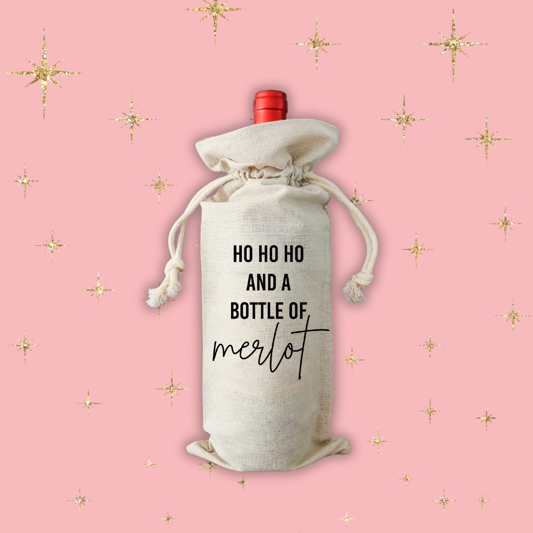 Maak je feestdagen extra feestelijk met onze linnen fleszak, bedrukt met de vrolijke tekst "Ho Ho Ho and a Bottle of Merlot"! Deze zak is perfect voor het inpakken van een fles Merlot (of je favoriete wijn) en brengt een glimlach op het gezicht van elke wijnliefhebber.