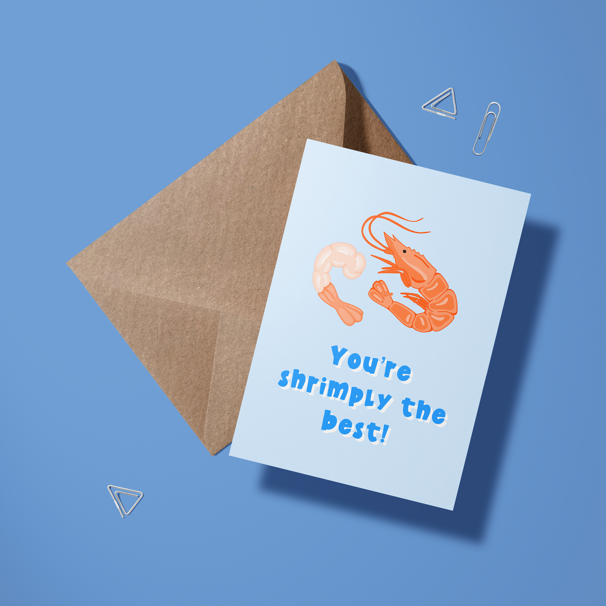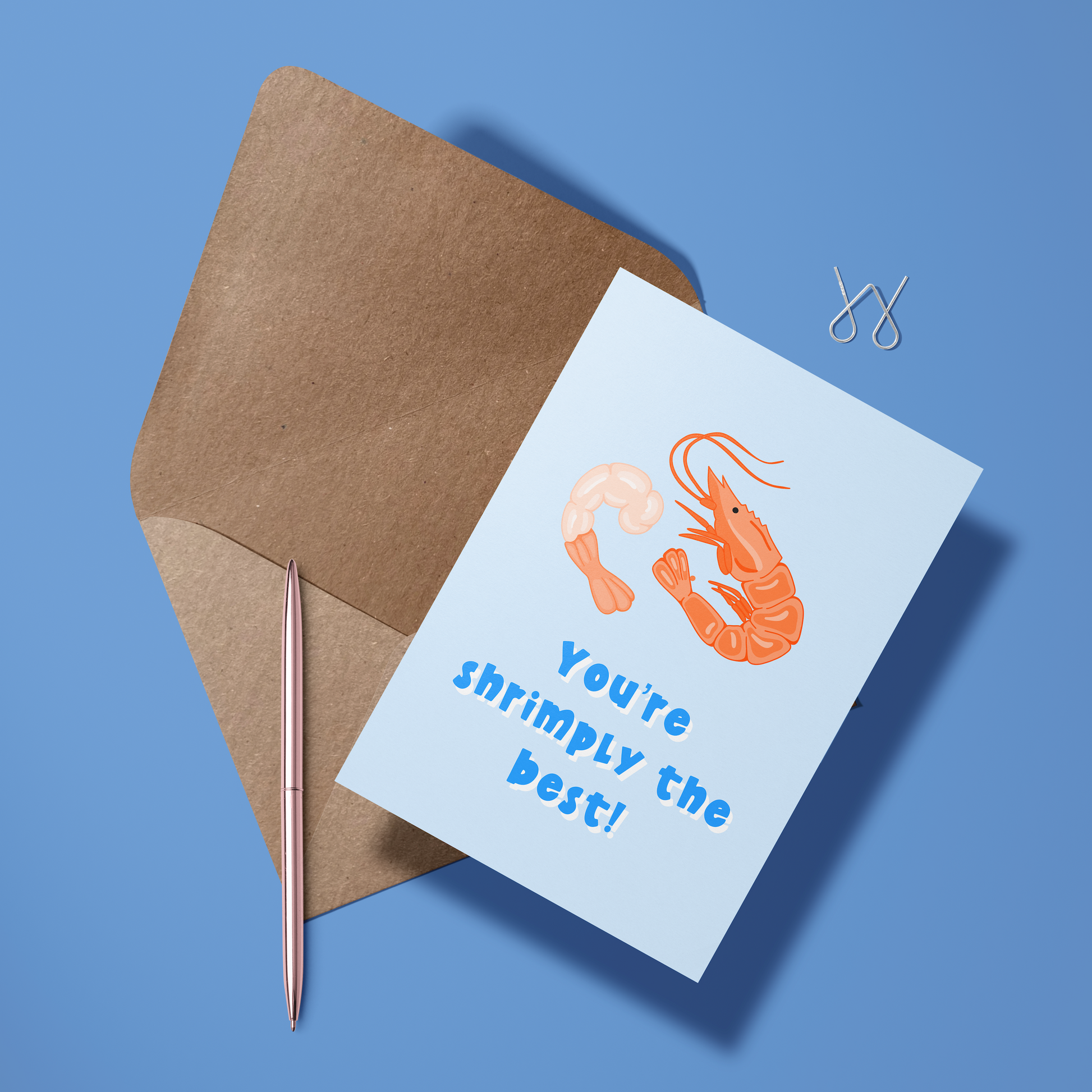 Deze kaart zegt het allemaal: "You're Shrimply the Best!" Met een knipoog en een glimlach laat je iemand weten dat ze fantastisch zijn. Een leuke en originele manier om te bedanken, perfect voor elke situatie waar een beetje humor welkom is!