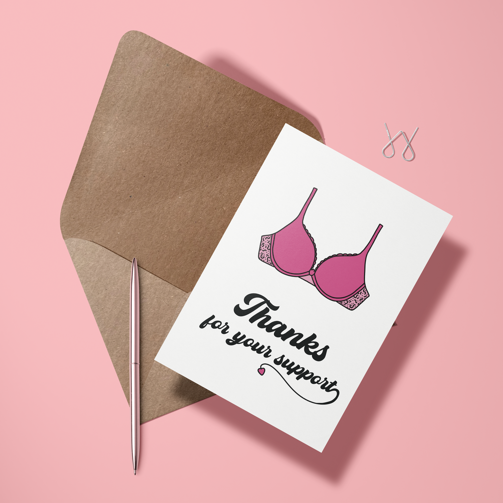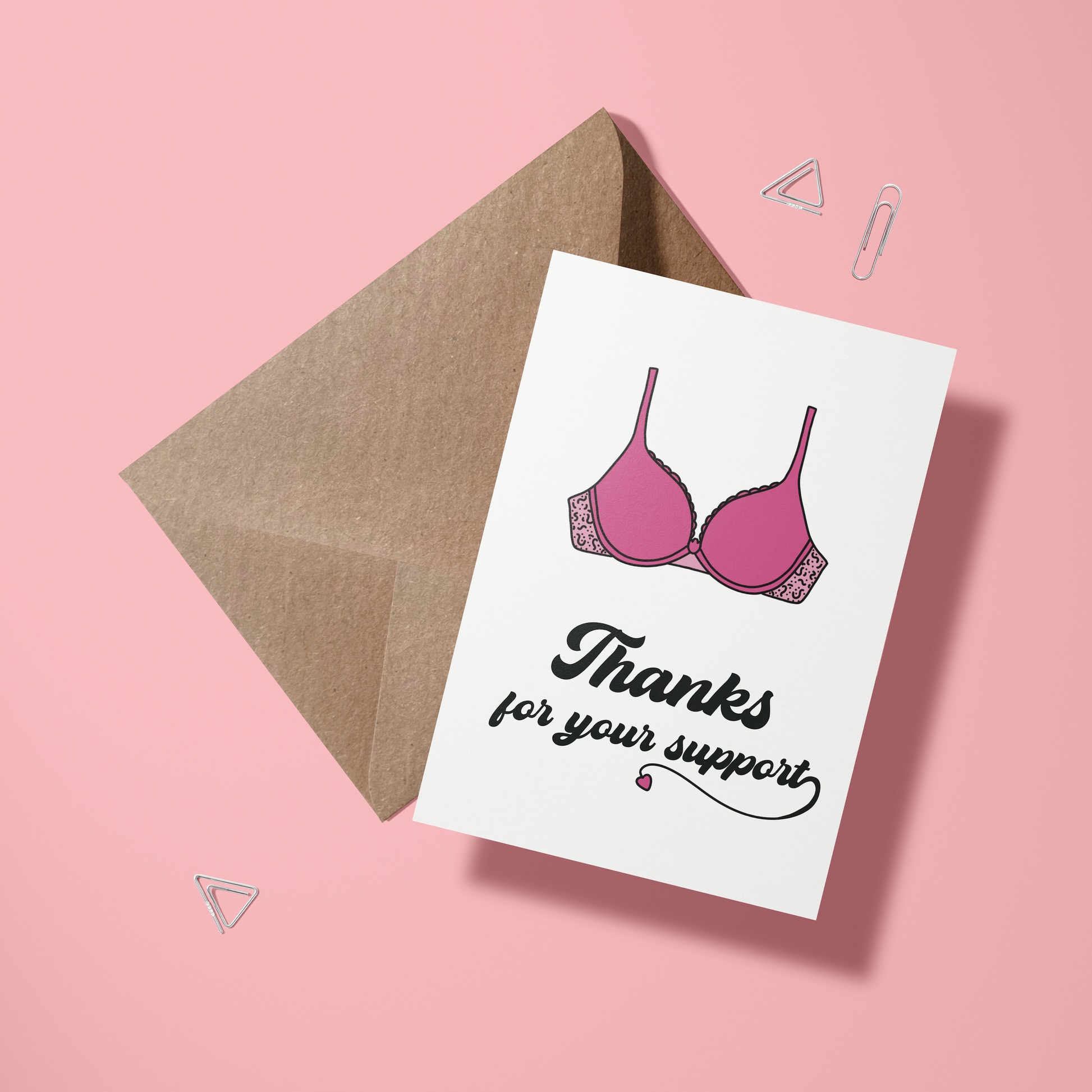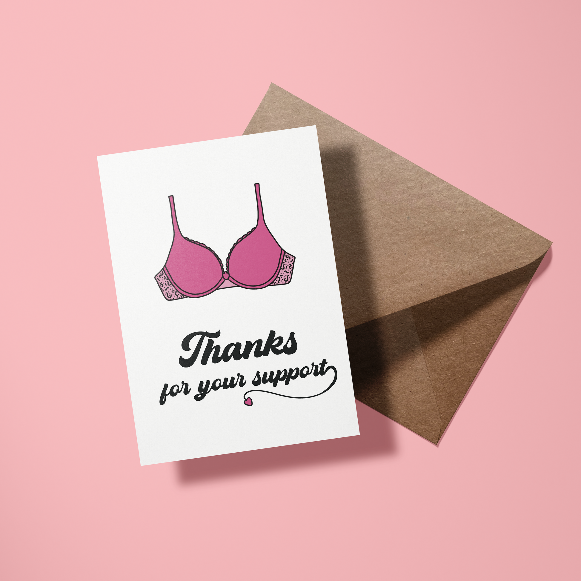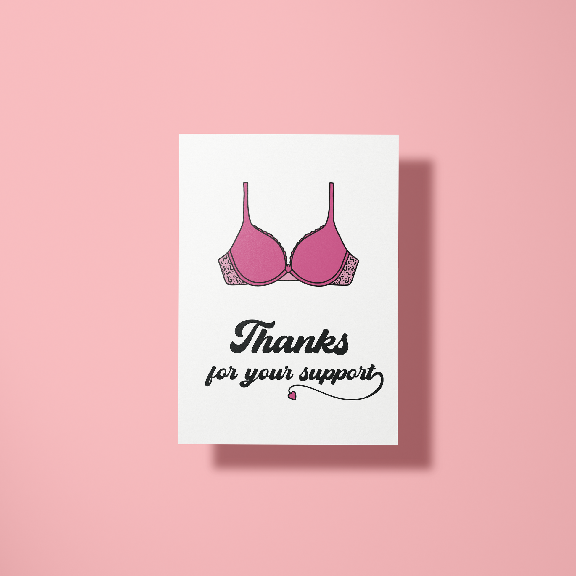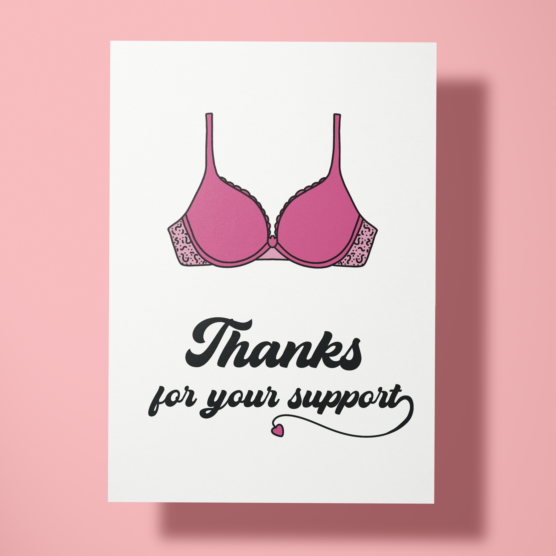 Zeg "dank je wel" met een flinke dosis humor! Deze kaart met een vrolijke roze BH en de tekst "Thanks for your support" laat zien dat je iemands steun net zo waardeert als de steun van een goede BH. Perfect voor diegene die altijd op de juiste momenten aanwezig is – omdat je soms gewoon wat extra ondersteuning nodig hebt. 💖