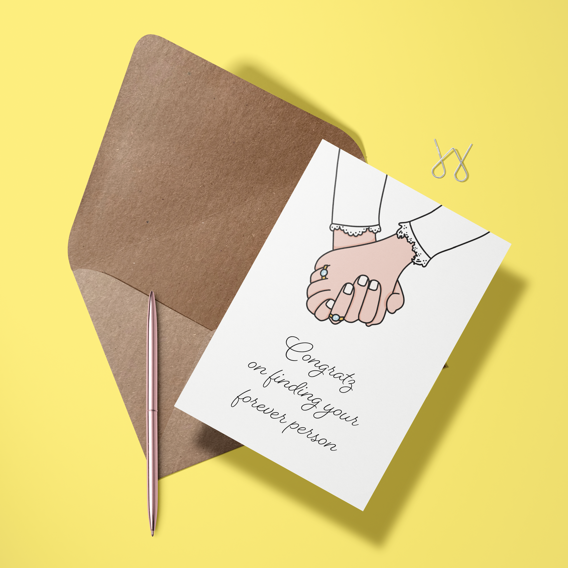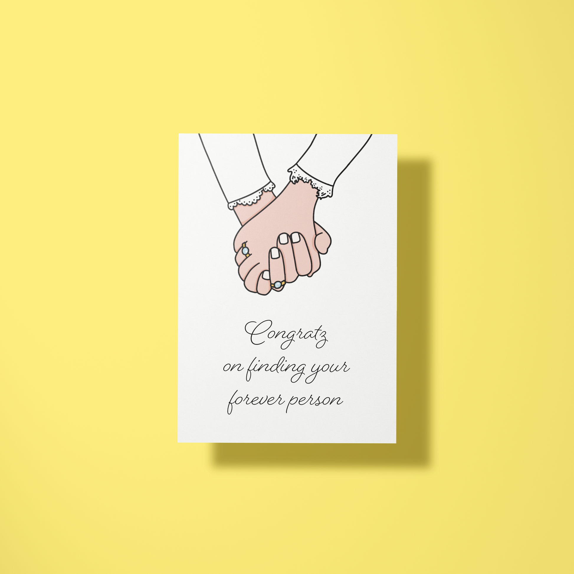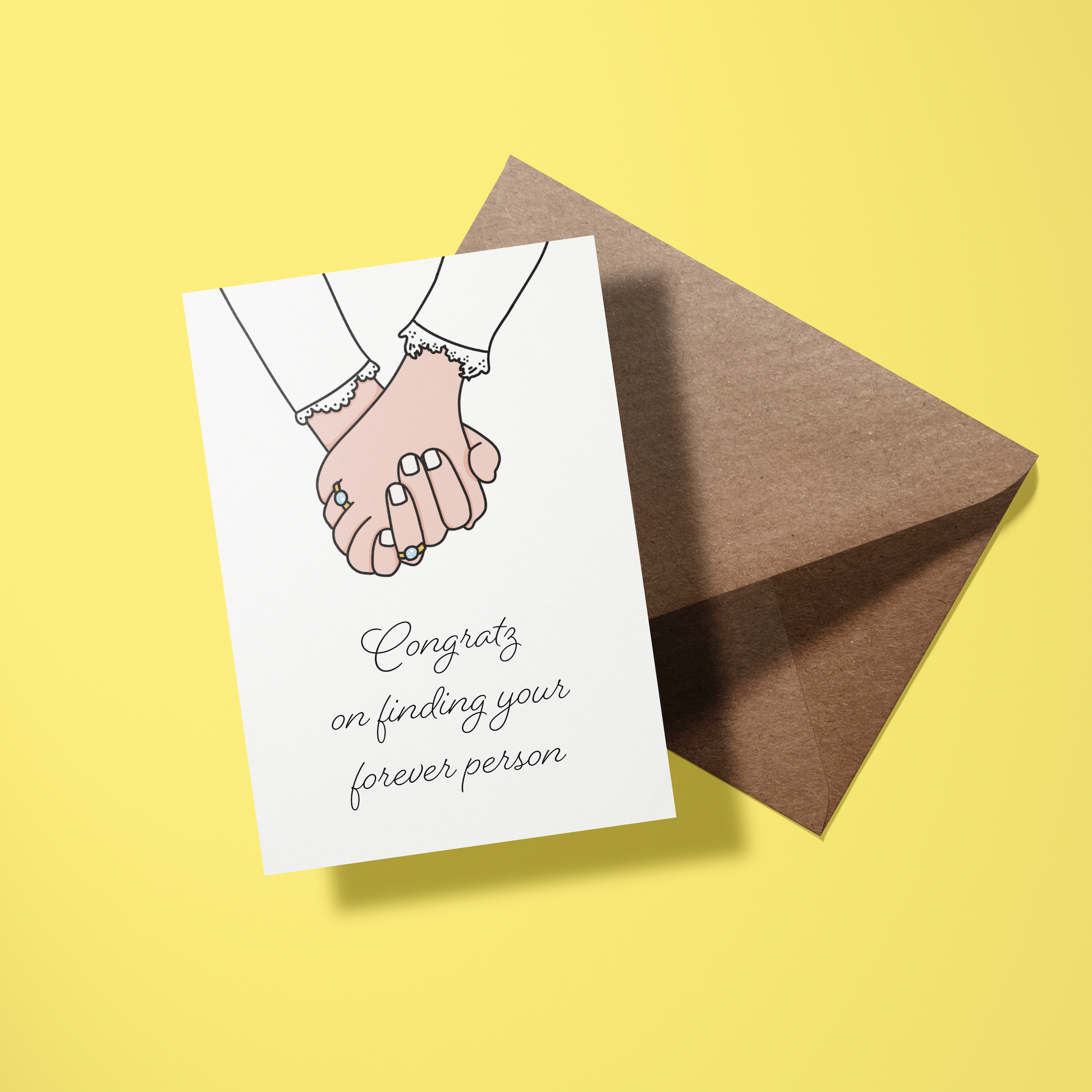 Met de tekst "Congratz on finding your forever person" geef je niet alleen een felicitatie, maar ook een vleugje warmte en romantiek mee. De binnenkant is leeg, zodat jij je eigen persoonlijke boodschap kunt toevoegen. Of het nu vol liefde is of met een knipoog, de keuze is aan jou!