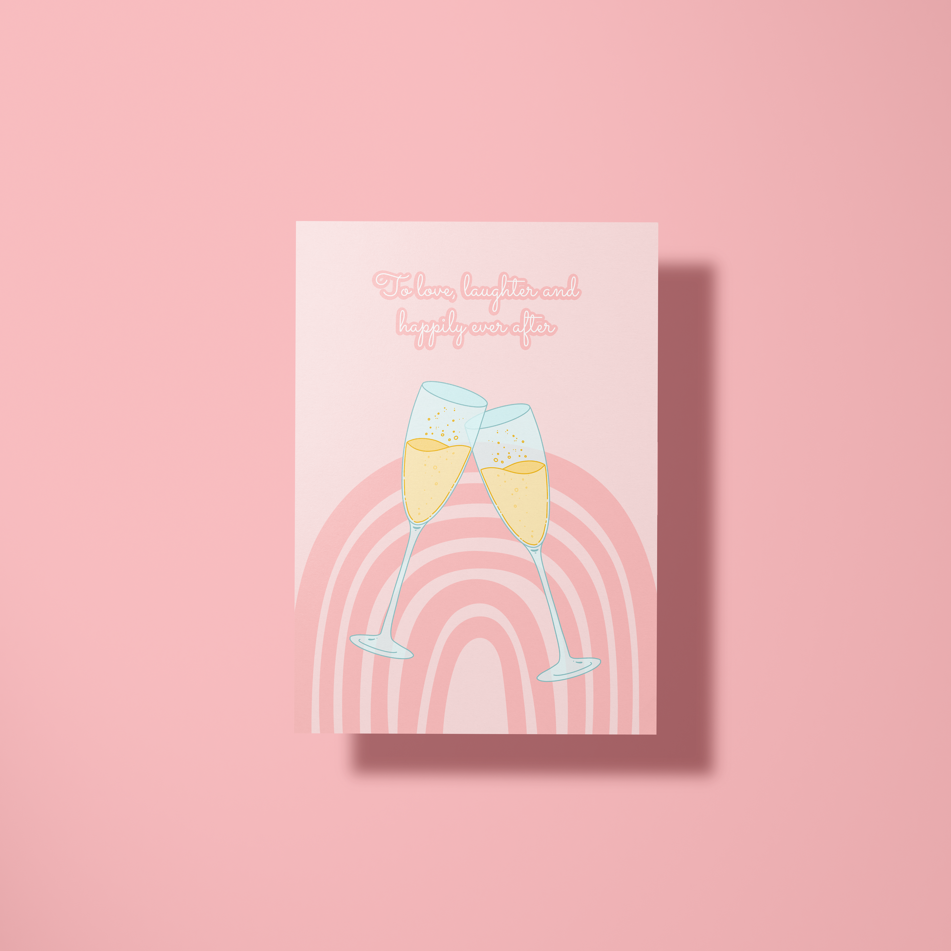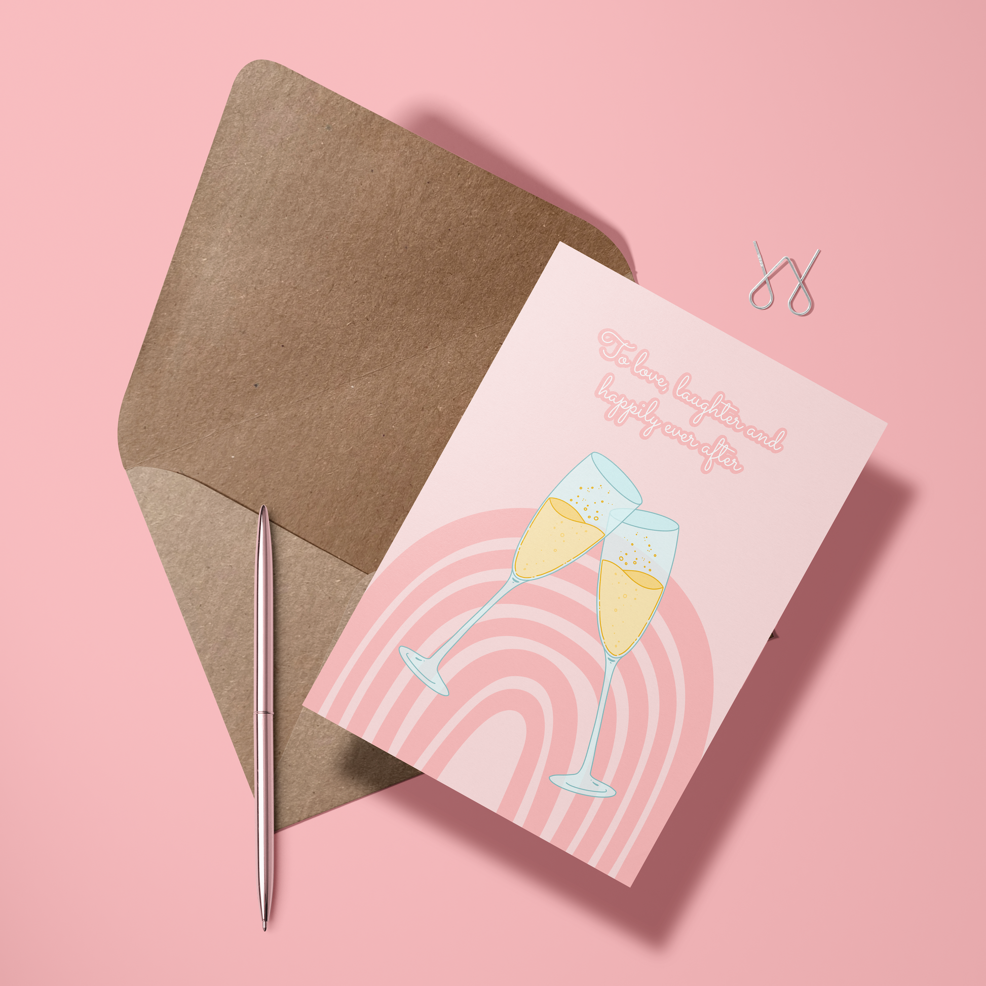 Deze charmante wenskaart viert de mooiste momenten van de liefde en het leven samen. Met een stijlvolle ontwerp dat het hart verwarmt, is deze kaart ideaal om je gelukwensen over te brengen aan het pasgetrouwde stel. De tekst straalt vreugde uit en herinnert hen eraan dat liefde, lachen en een gelukkige toekomst hand in hand gaan.