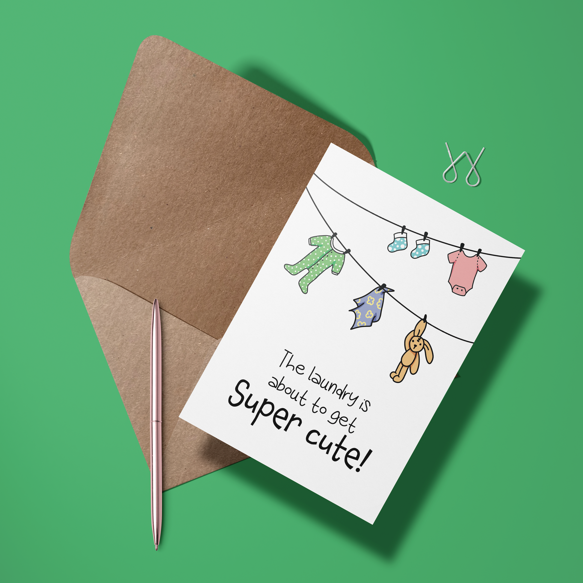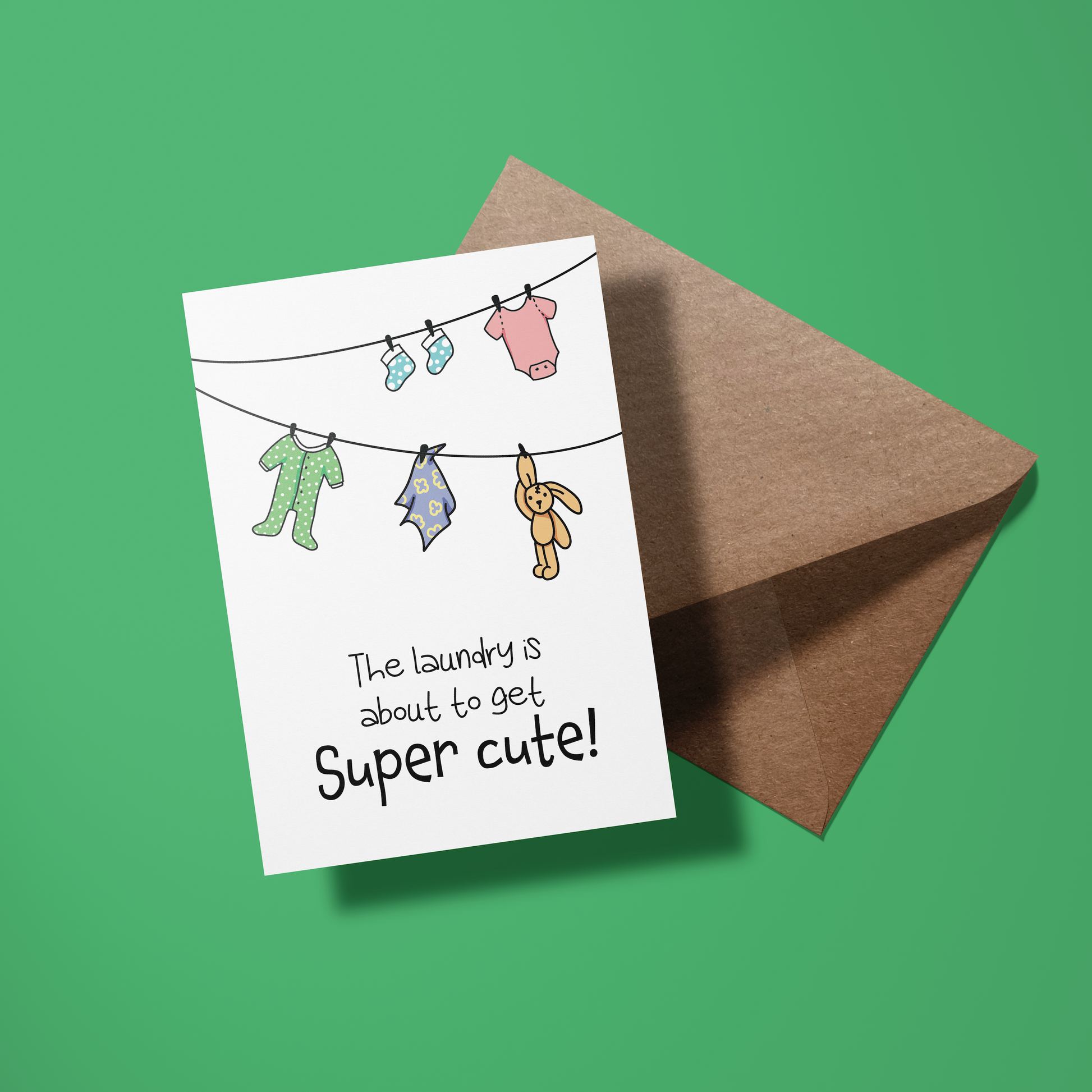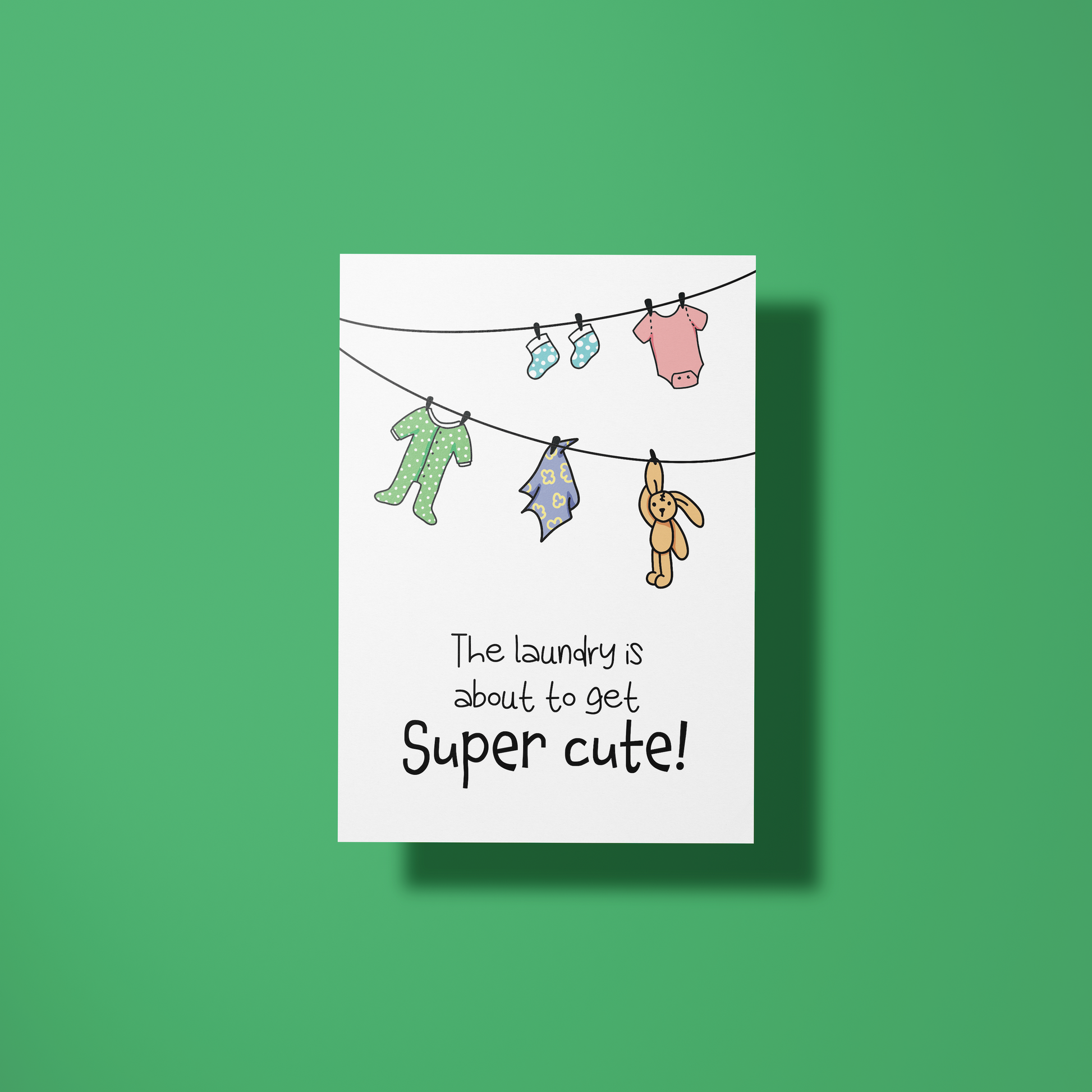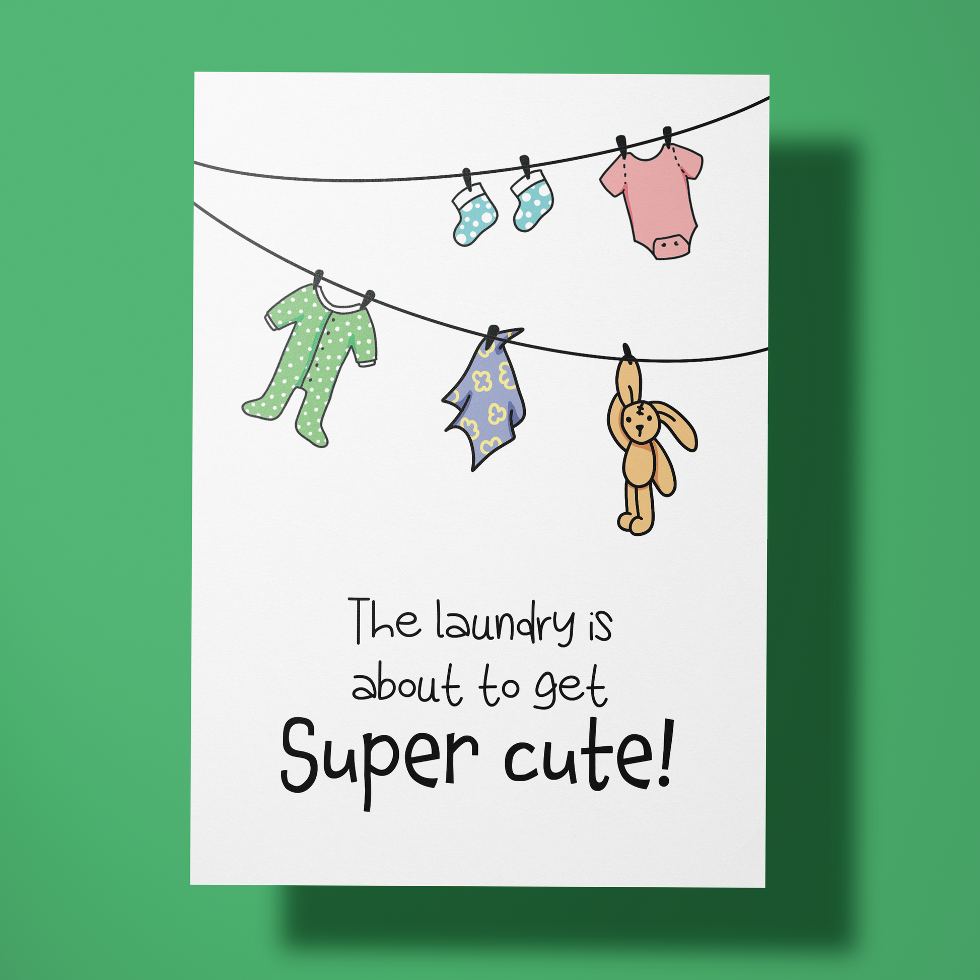 Met de tekst "The laundry is about to get super cute" brengen we een vleugje humor en vreugde in dit bijzondere moment. Deze kaart is niet alleen een felicitatie, maar ook een leuke aankondiging dat er een flinke dosis schattigheid op komst is.