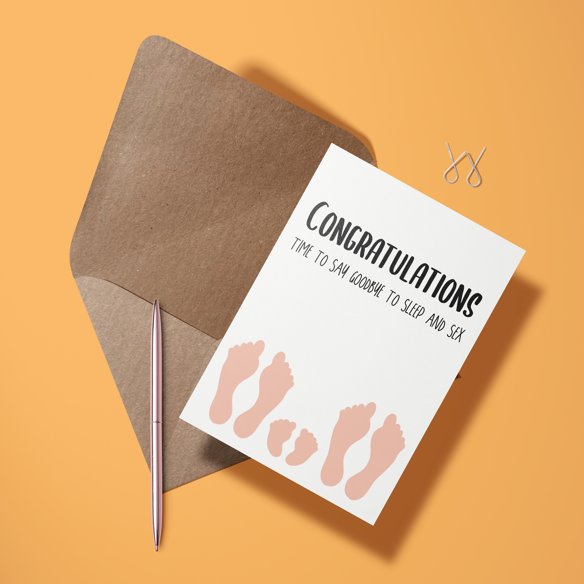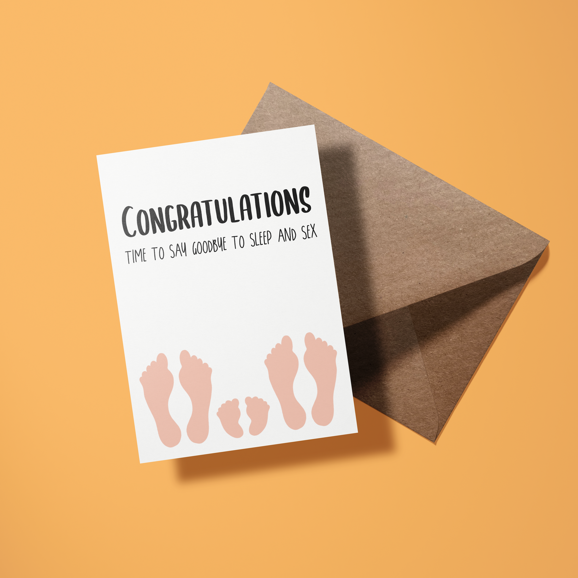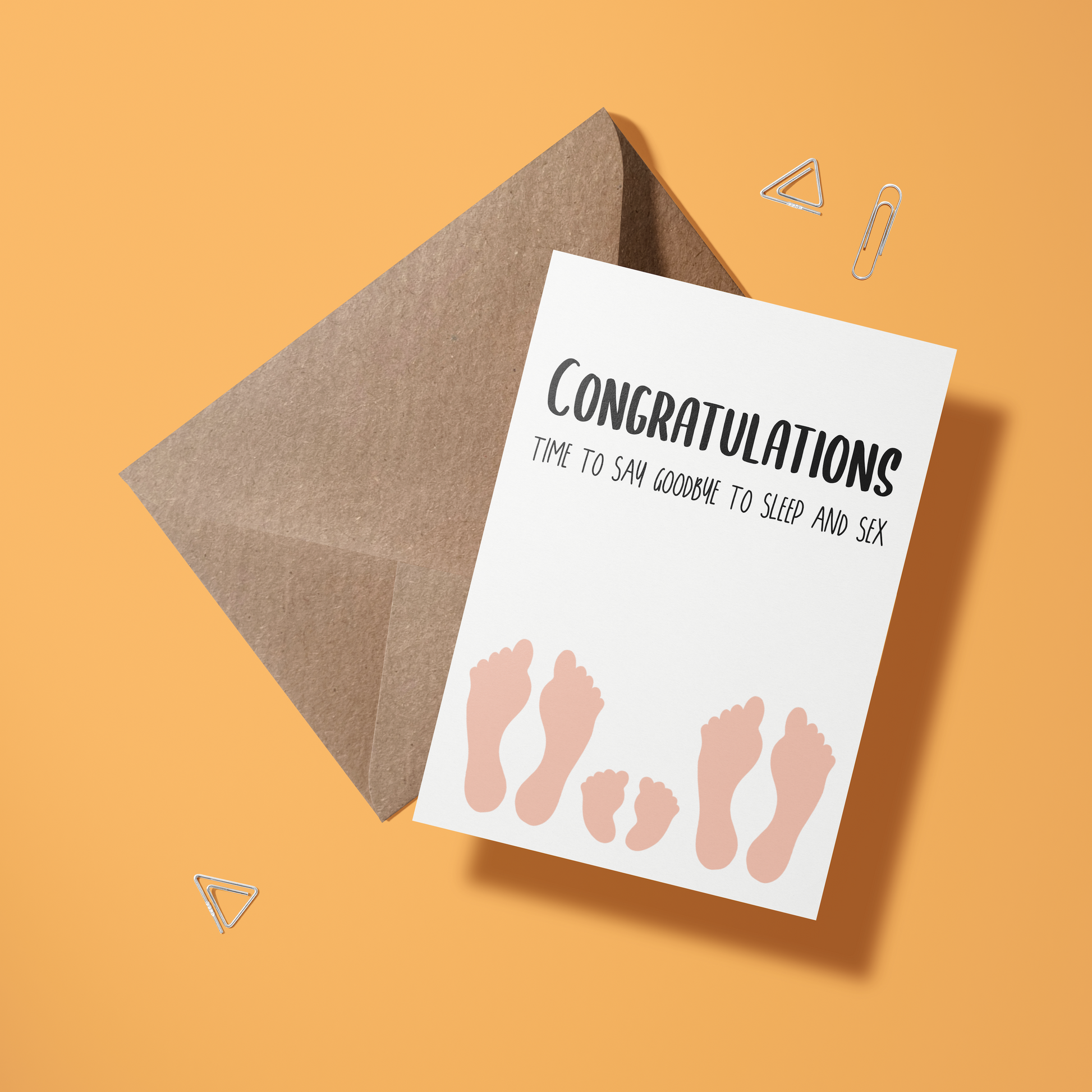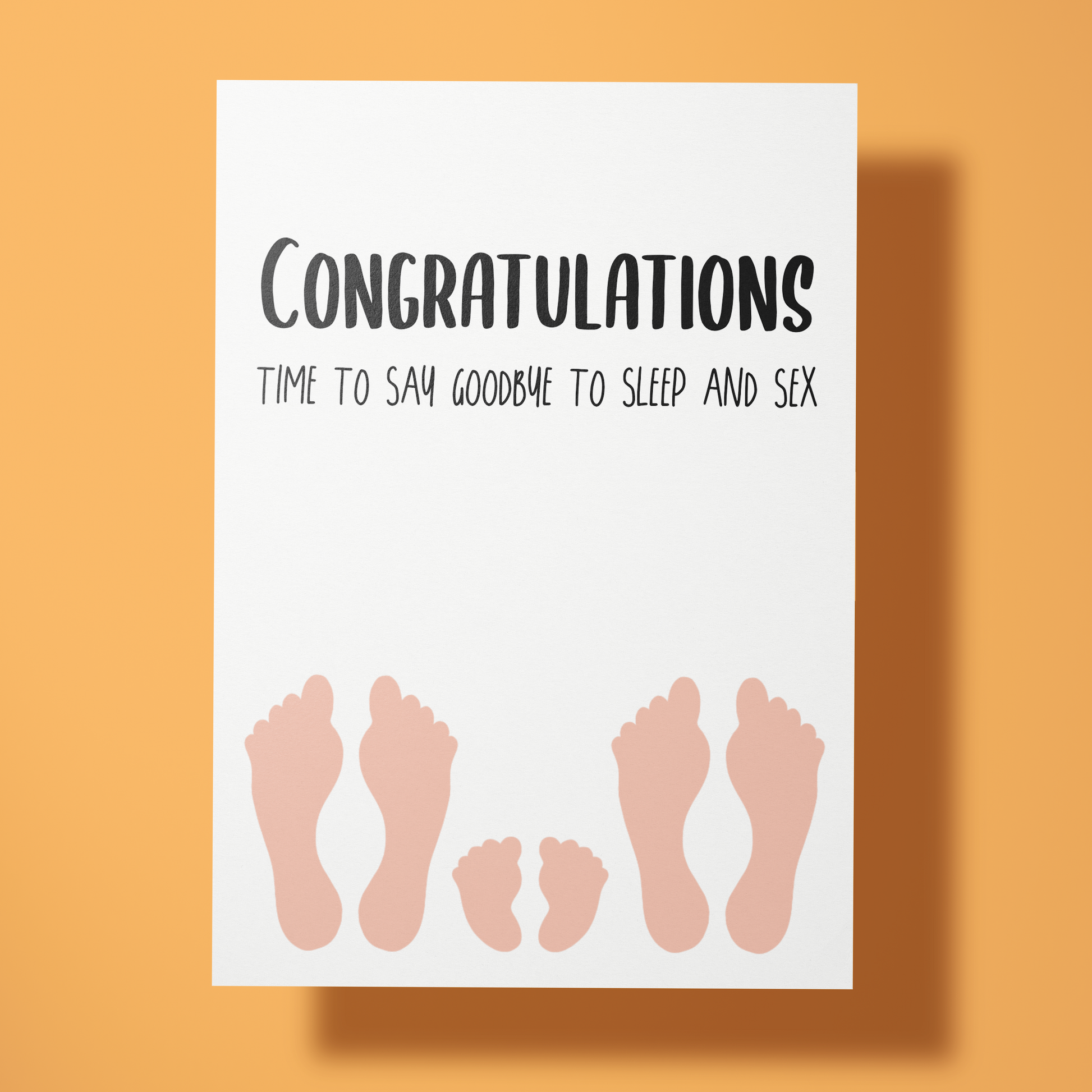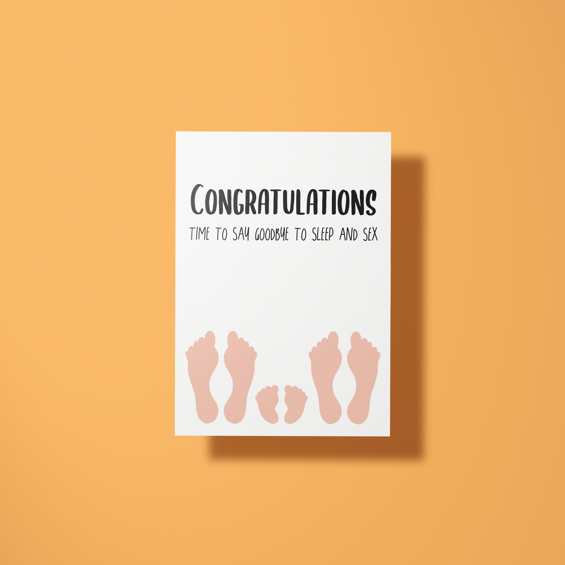 Vier de komst van een nieuw leven met een flinke dosis humor! Deze opvallende geboortekaart brengt een glimlach op het gezicht van aanstaande ouders met de tekst “Congratulations, time to say goodbye to sleep and sex.” Perfect voor iedereen die de realiteit van het ouderschap op een luchtige manier wil vieren.