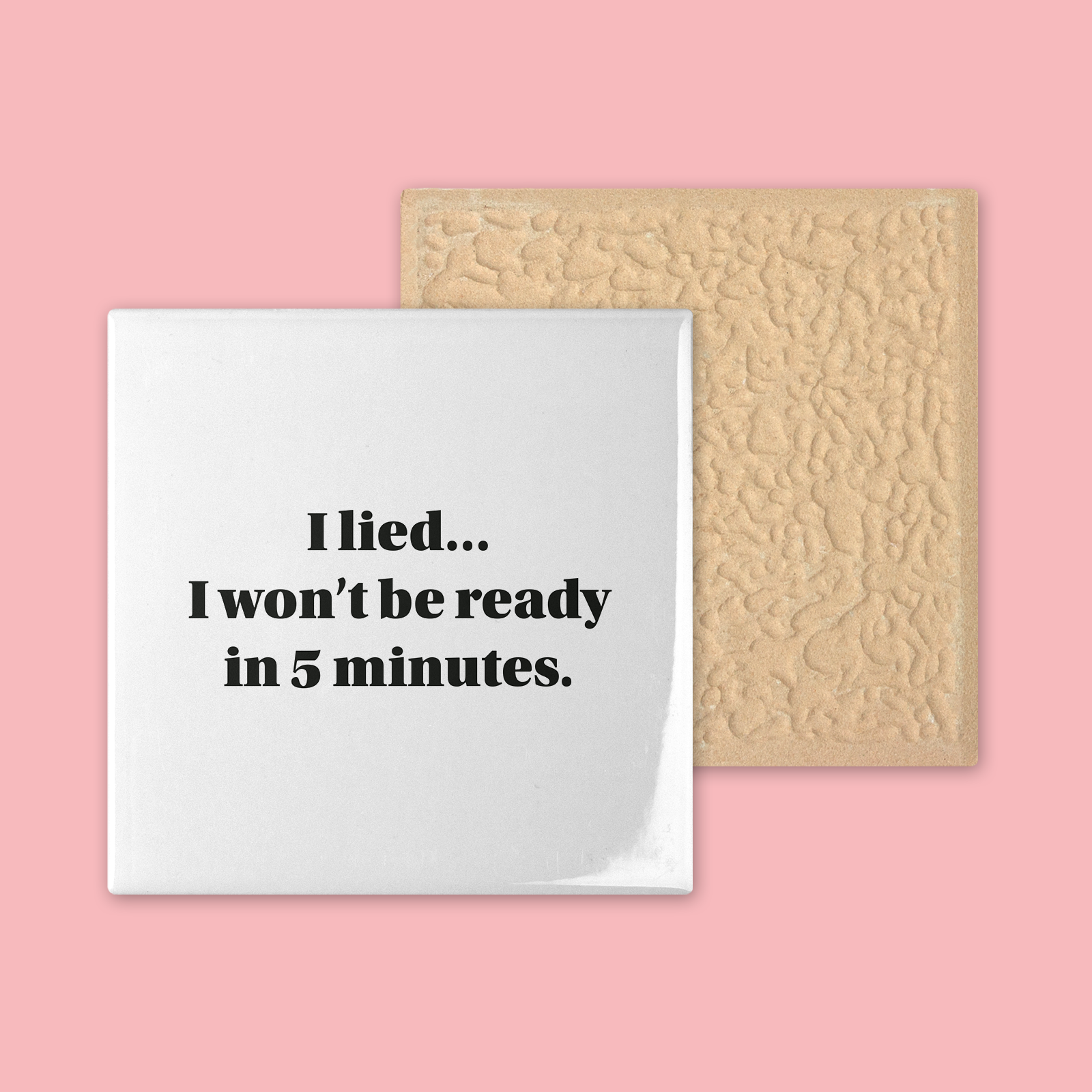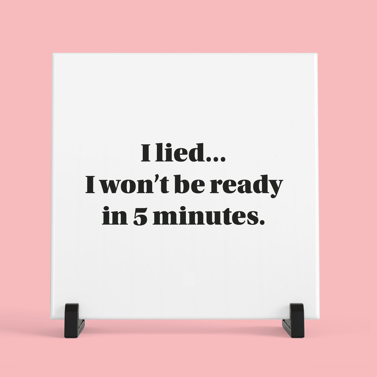 Voeg een vleugje speelse humor toe aan je badkamer met deze grappige tegel! "I lied... I won't be ready in 5 minutes." zorgt gegarandeerd voor een lach.