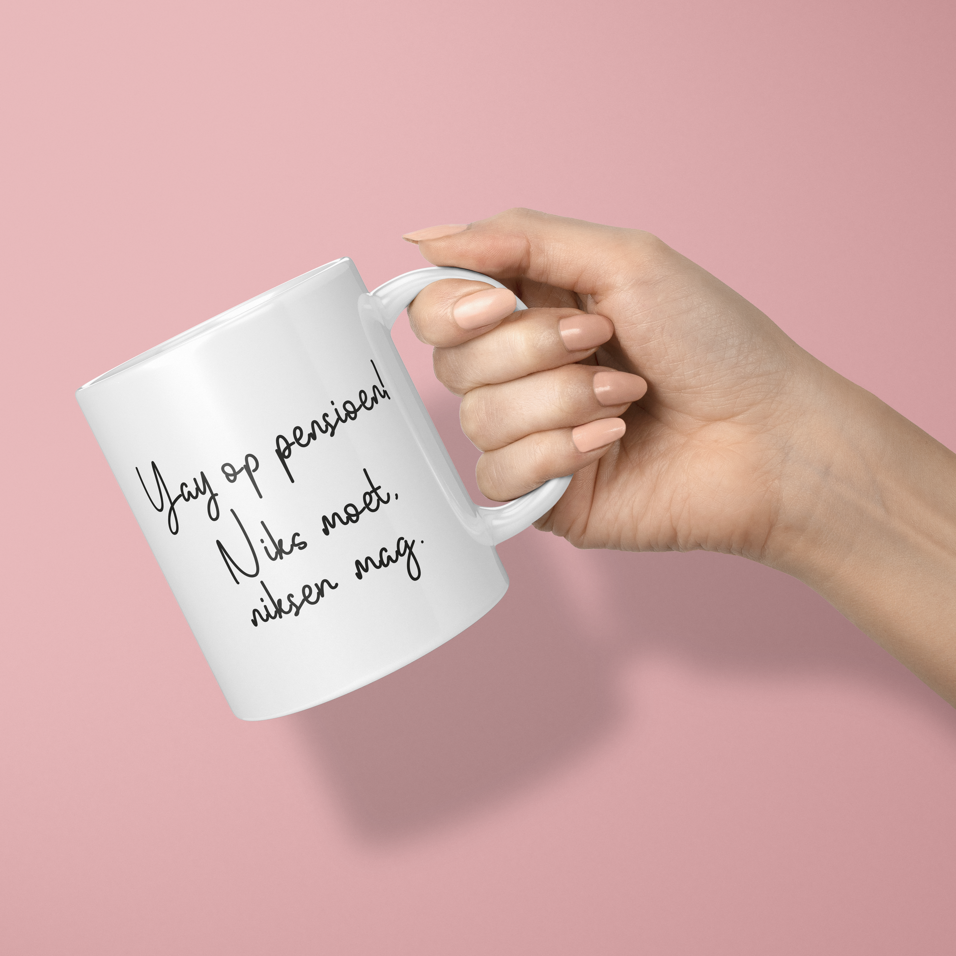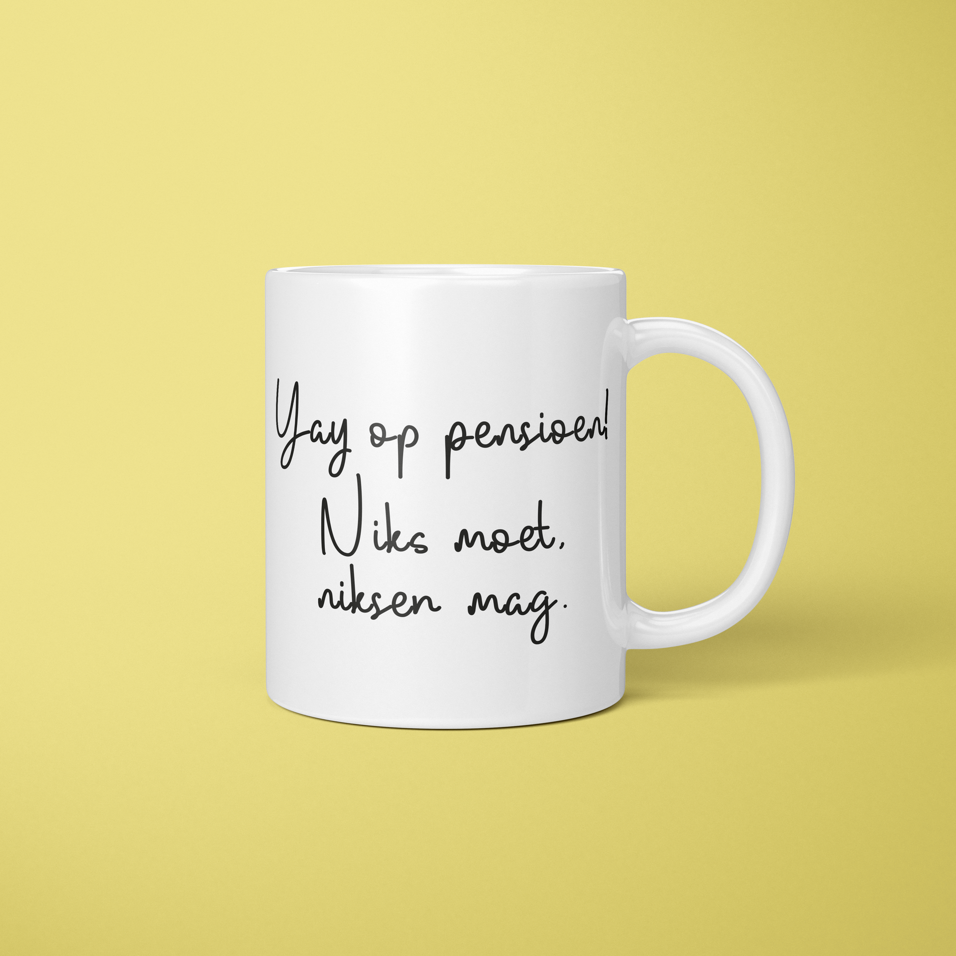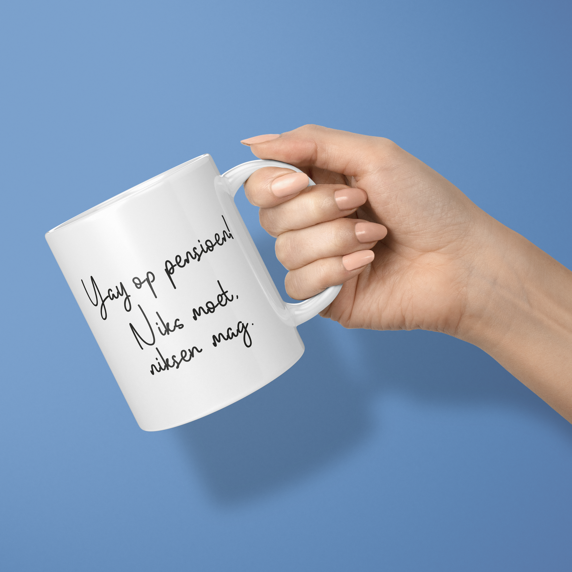 Vier de speciale mijlpaal van pensionering met een cadeau dat zowel praktisch als hartverwarmend is. Met de quote "Pensioen niks moet niksen mag" Deze mok is een perfecte manier om iemand te feliciteren met hun pensioen en hen te laten weten hoeveel ze gewaardeerd worden.