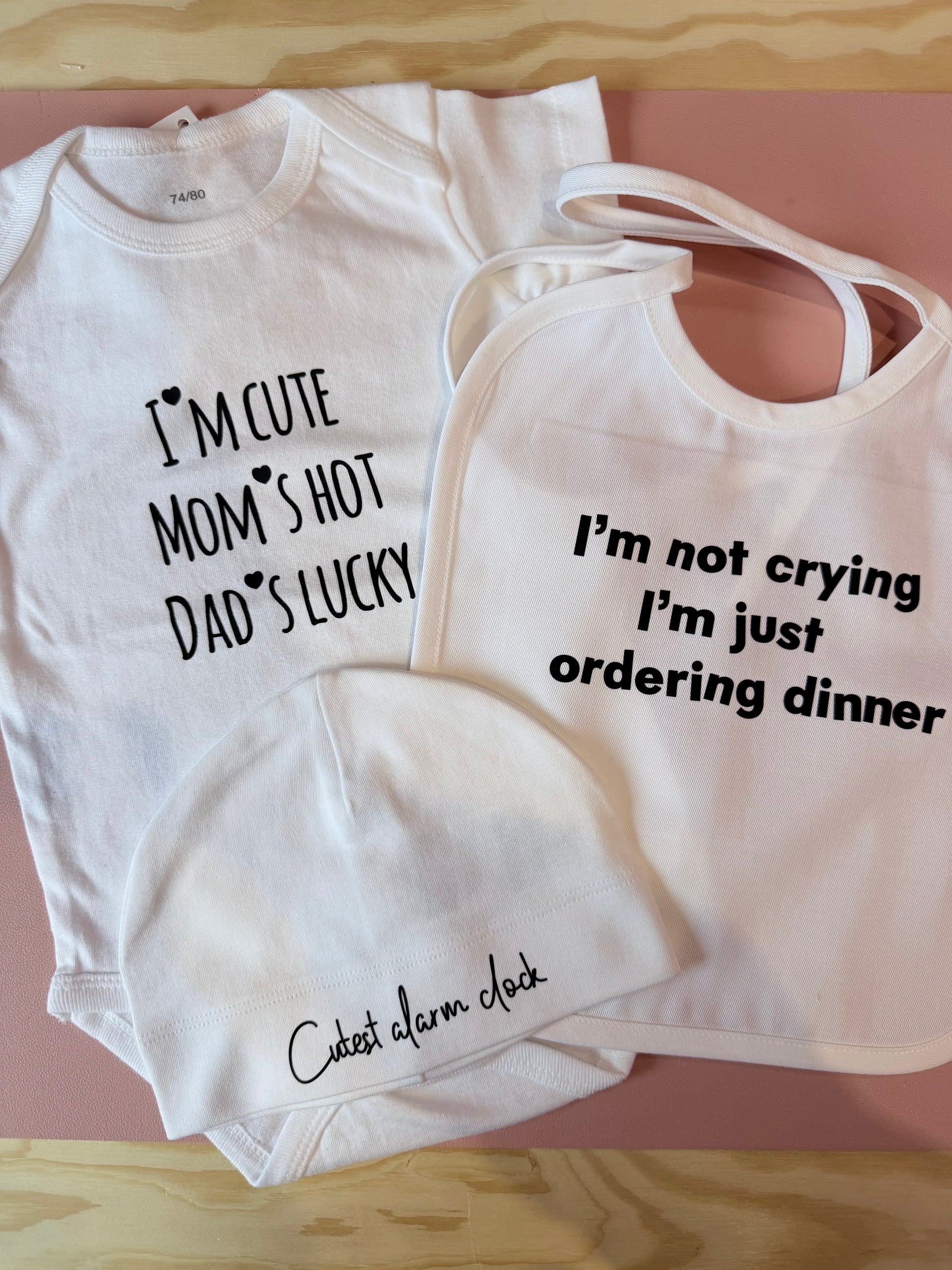 Je ontvangt 1 muts + 1 slabbetje + 1 romper