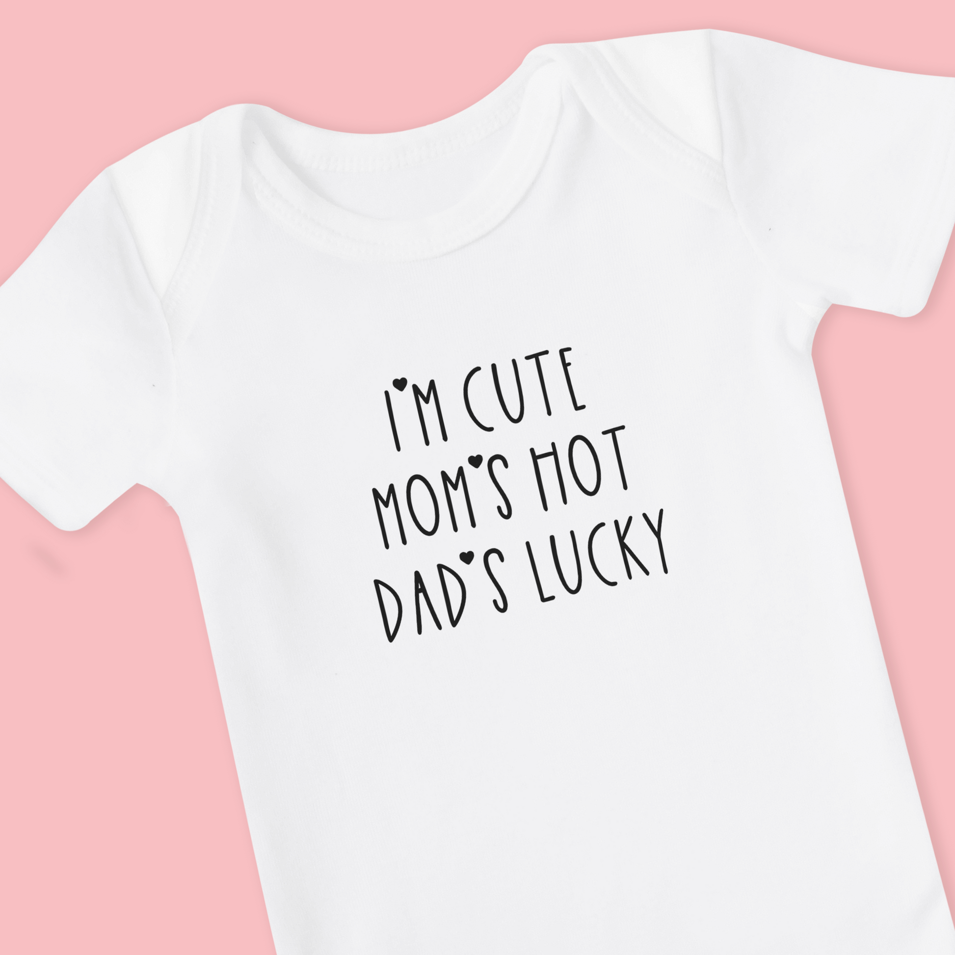 Wat deze onesie echt uniek maakt, is de grappige en charmante tekst "I'm cute, Mom's hot, Dad's lucky". Deze leuke boodschap zorgt gegarandeerd voor een lach op ieders gezicht. Van grappige uitspraken tot hartverwarmende woorden, onze ontwerpen zorgen voor perfecte fotomomenten die je voor altijd zult koesteren.