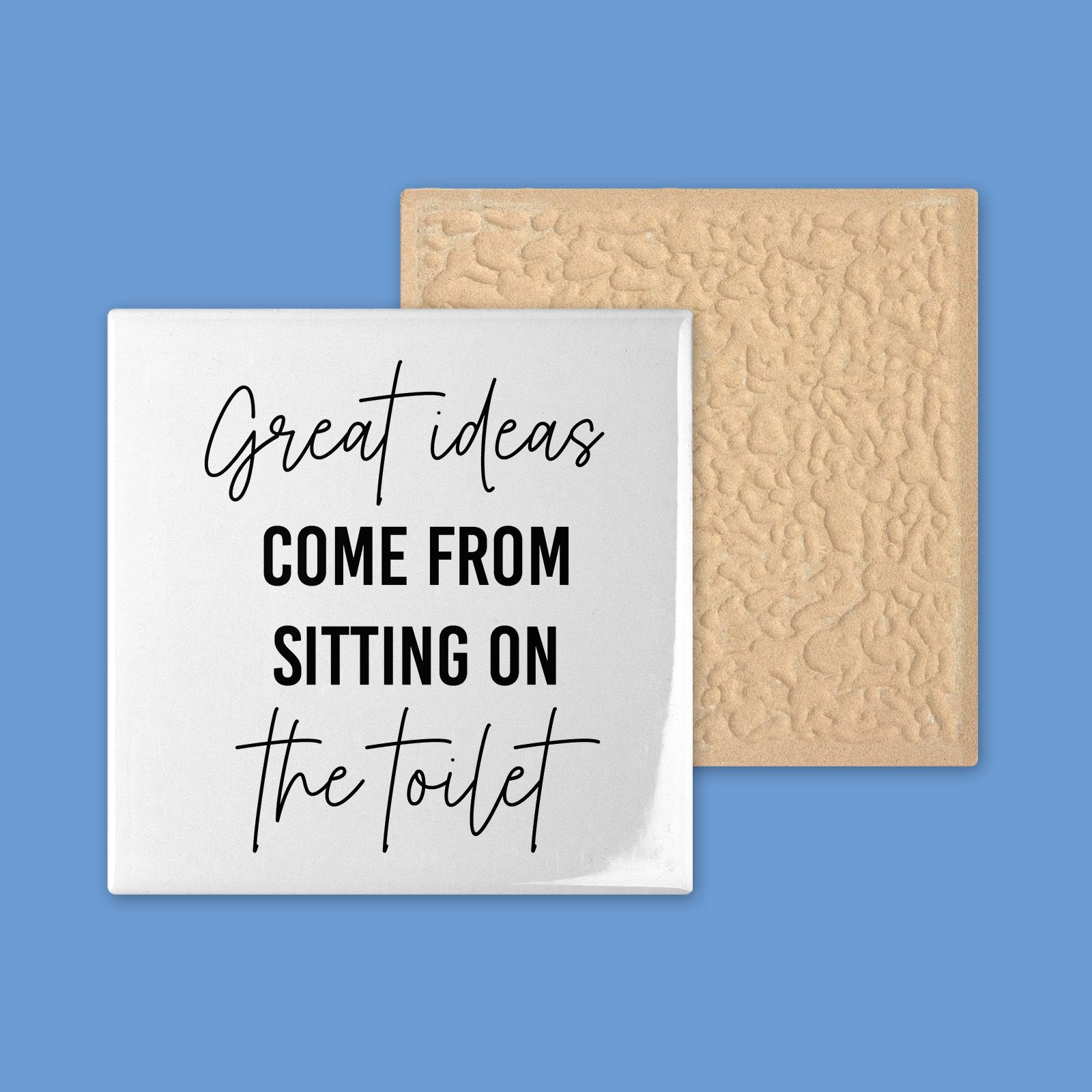 Laat de inspiratie stromen met deze slimme tegel! "Great ideas come from sitting on the toilet" herinnert je eraan dat de beste ideeën vaak op onverwachte momenten komen. Onze tegel is een leuke badkamer en toilet decoratie die zeker een glimlach met zich meebrengt.
