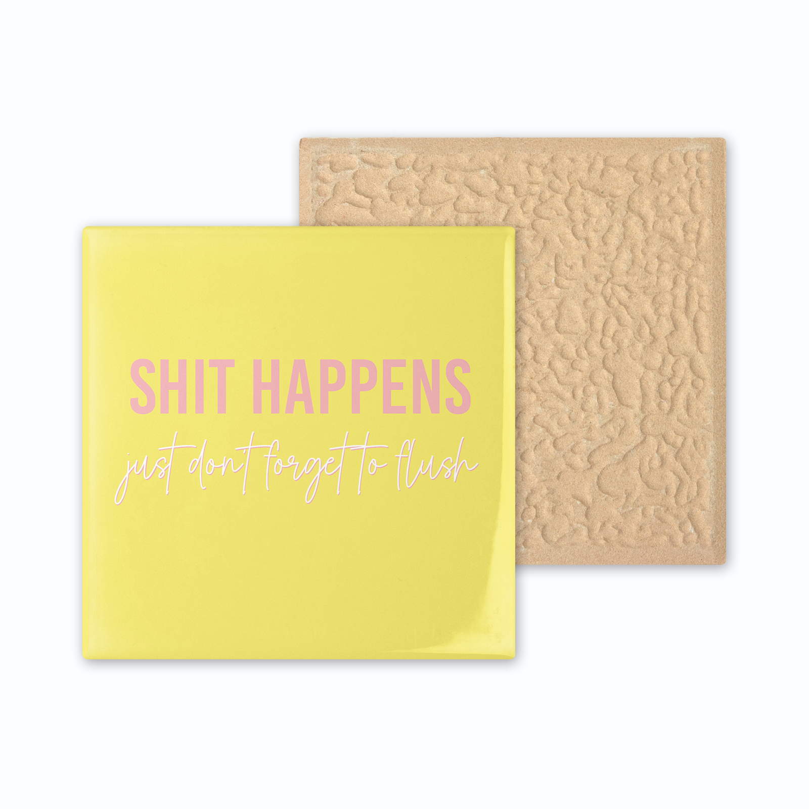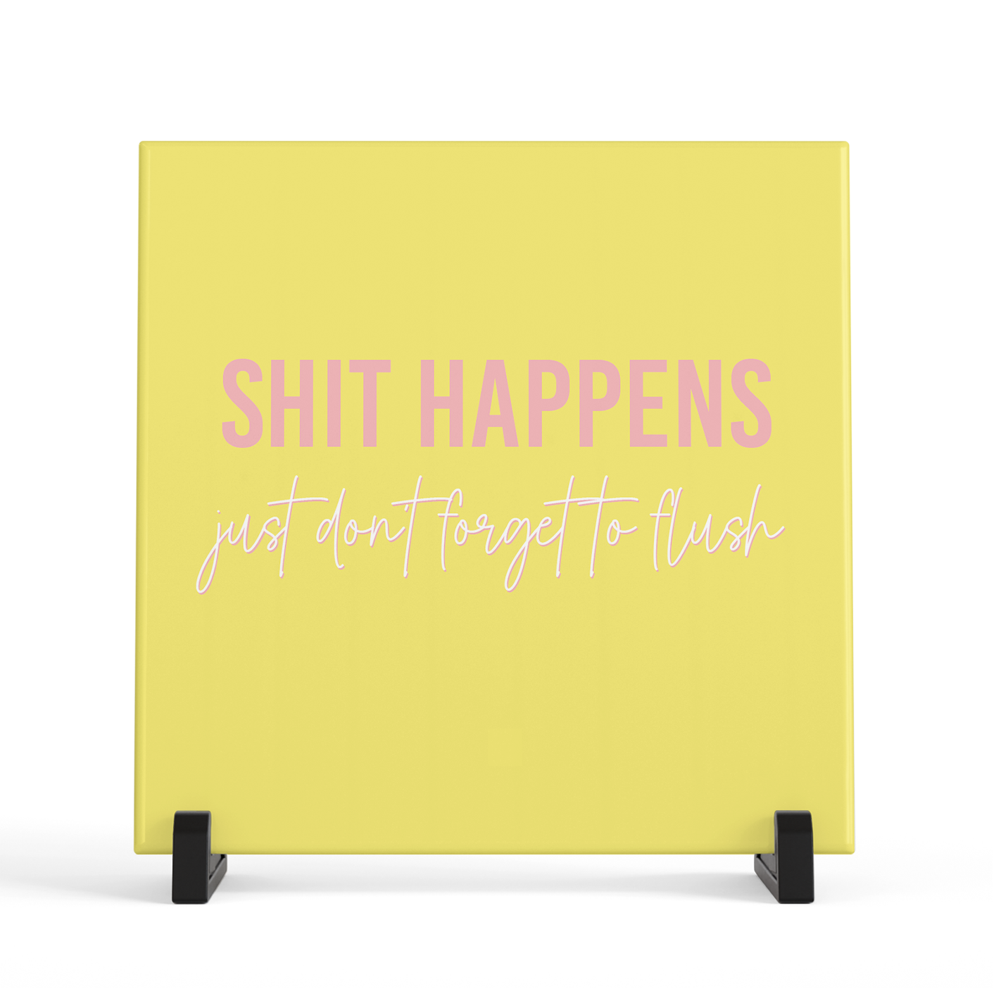 Voeg een vleugje humor toe aan je badkamer met deze hilarische tegel! "Shit happens, just don’t forget to flush" brengt gegarandeerd een glimlach op ieders gezicht.