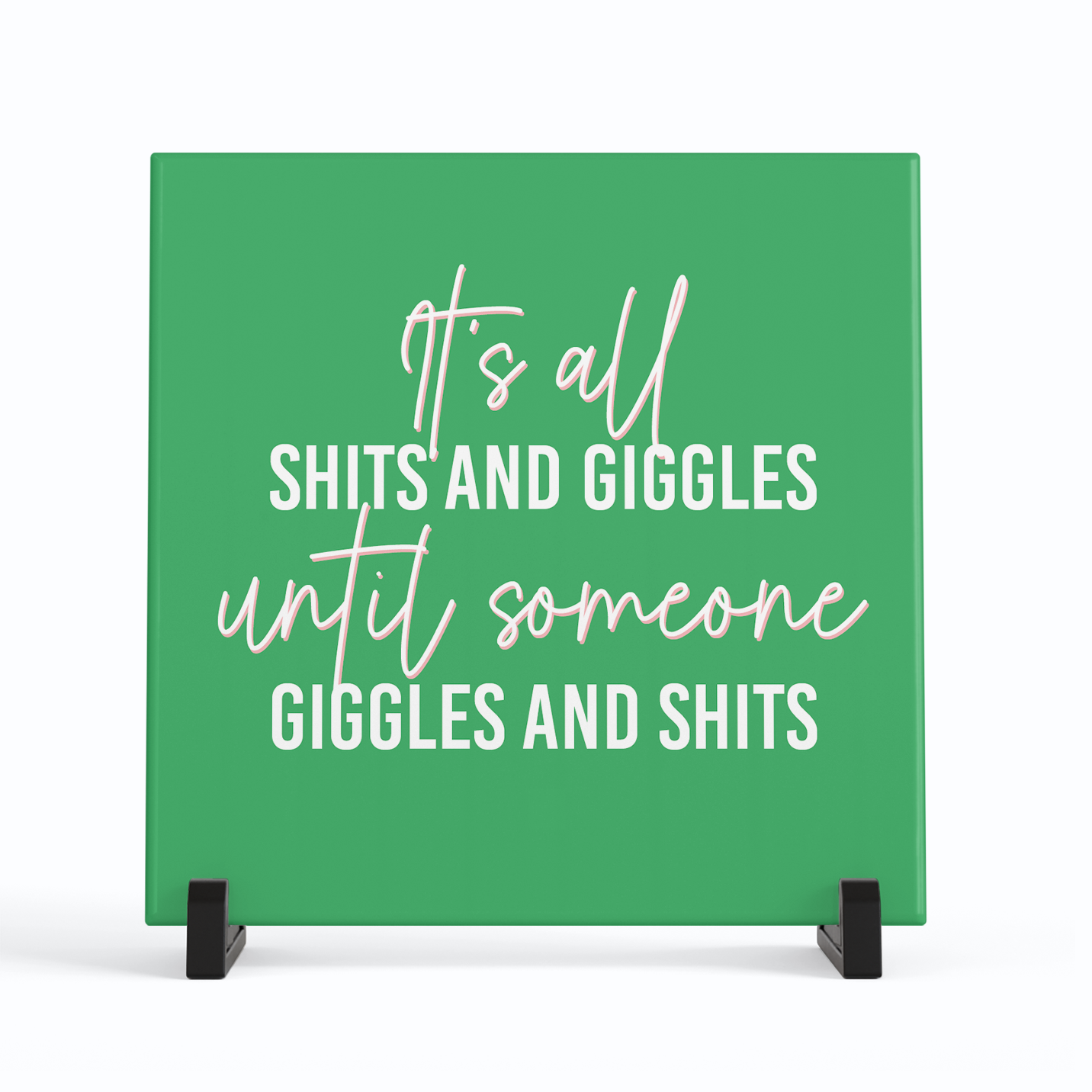 Voeg een vleugje speelse humor toe aan je badkamer met deze grappige tegel! "It’s all shits & giggles until someone giggles & shits" zorgt gegarandeerd voor een lach.