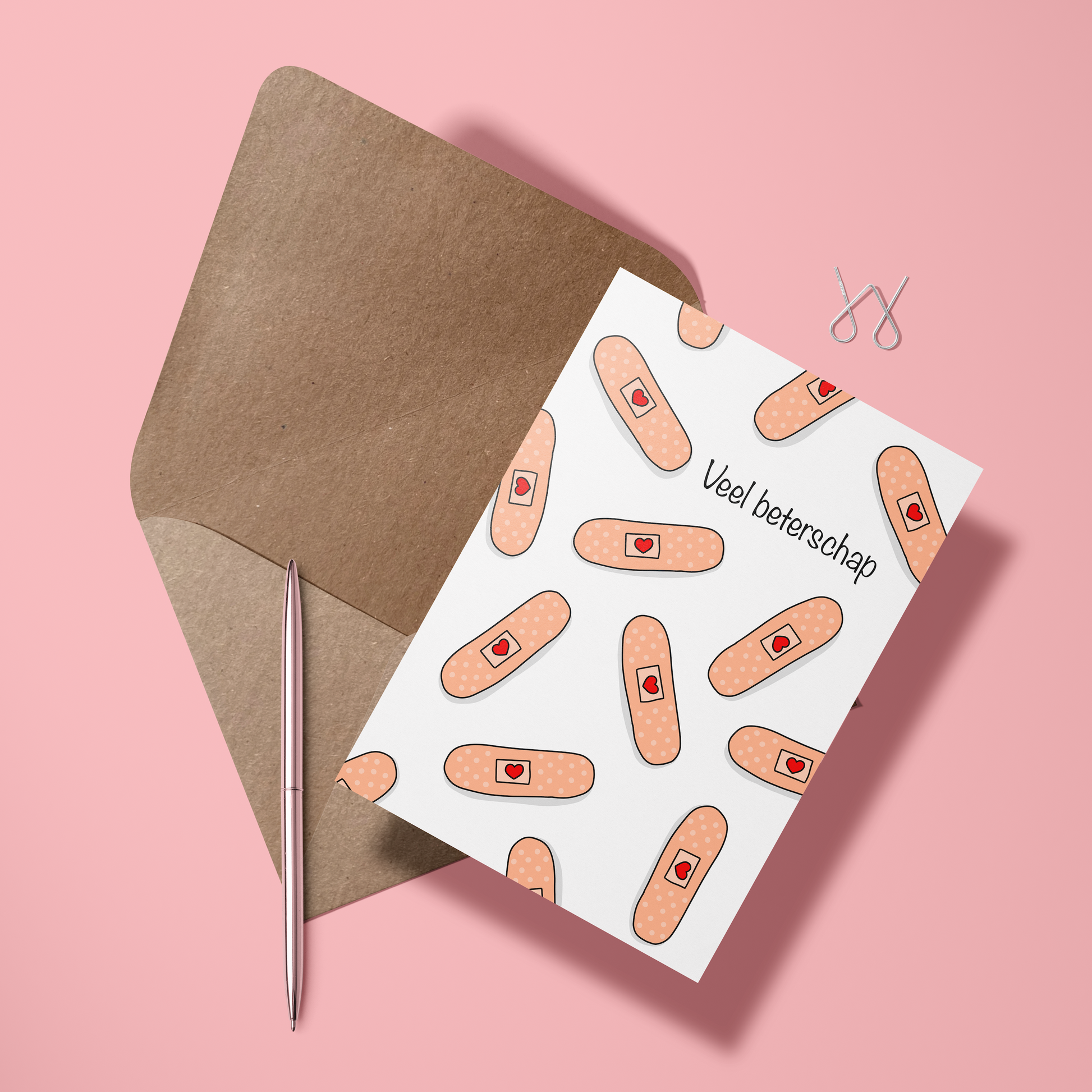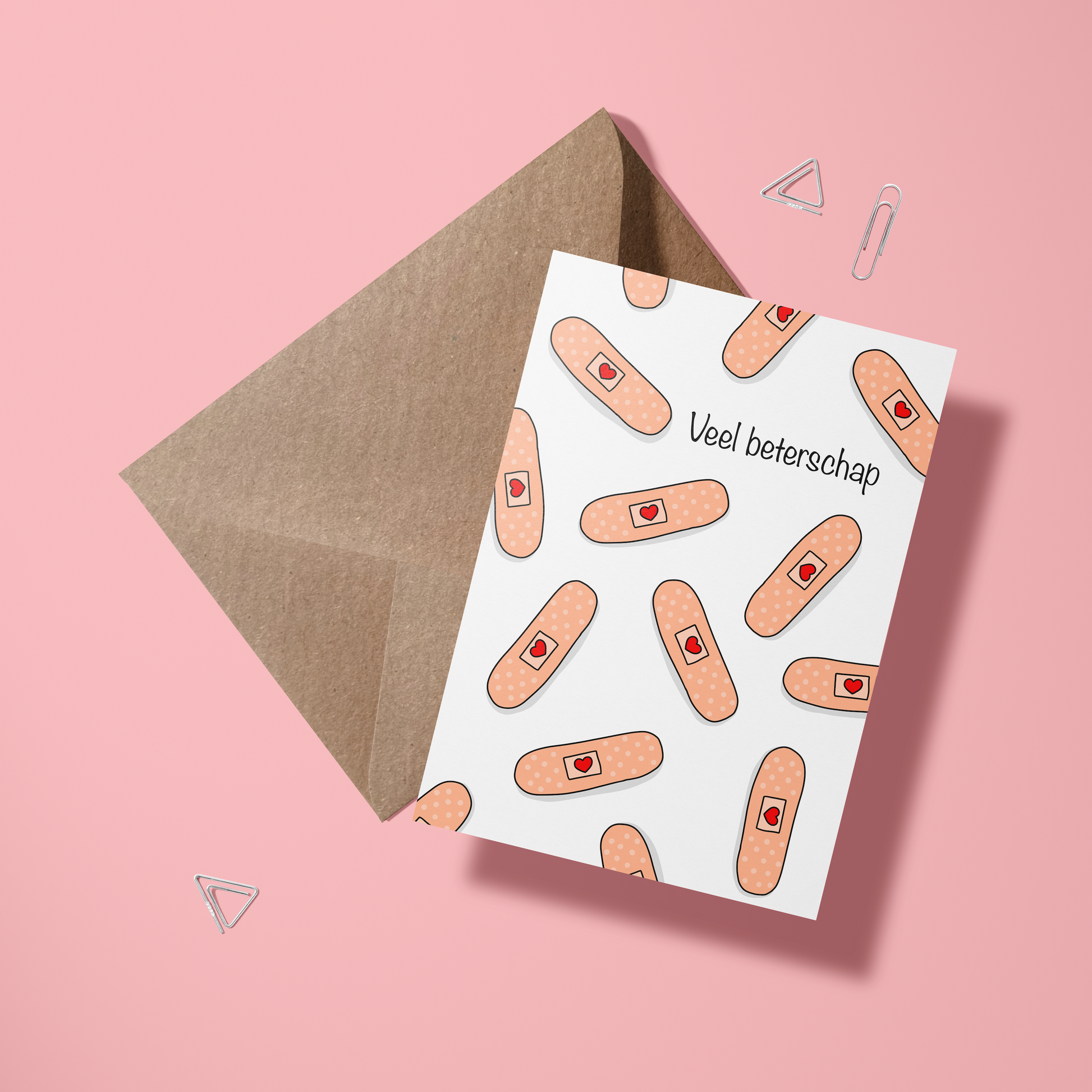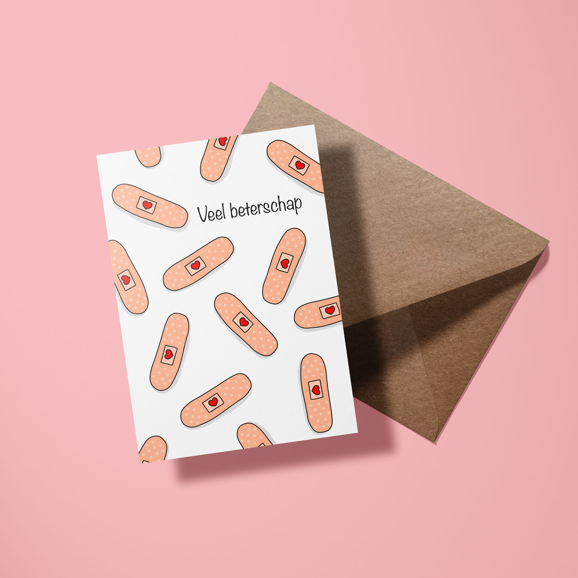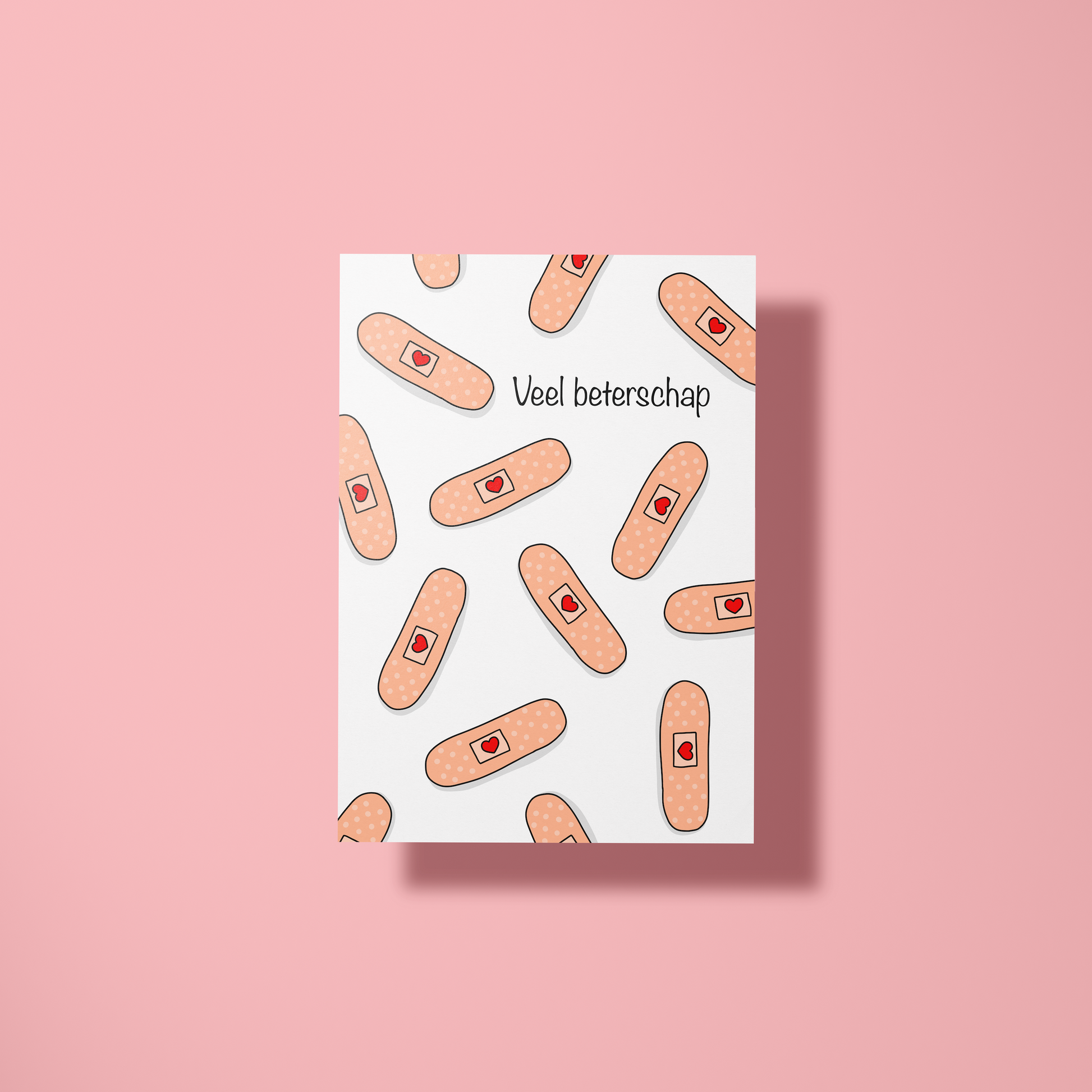 Een beetje liefde en een paar pleisters kunnen wonderen doen! Stuur een flinke dosis beterschap met deze beterschapskaart vol lieve getekende pleisters versierd met hartjes. De vrolijke illustraties brengen direct een glimlach op het gezicht van de zieke. Perfect om iemand op te vrolijken en te laten weten dat je aan ze denkt.
