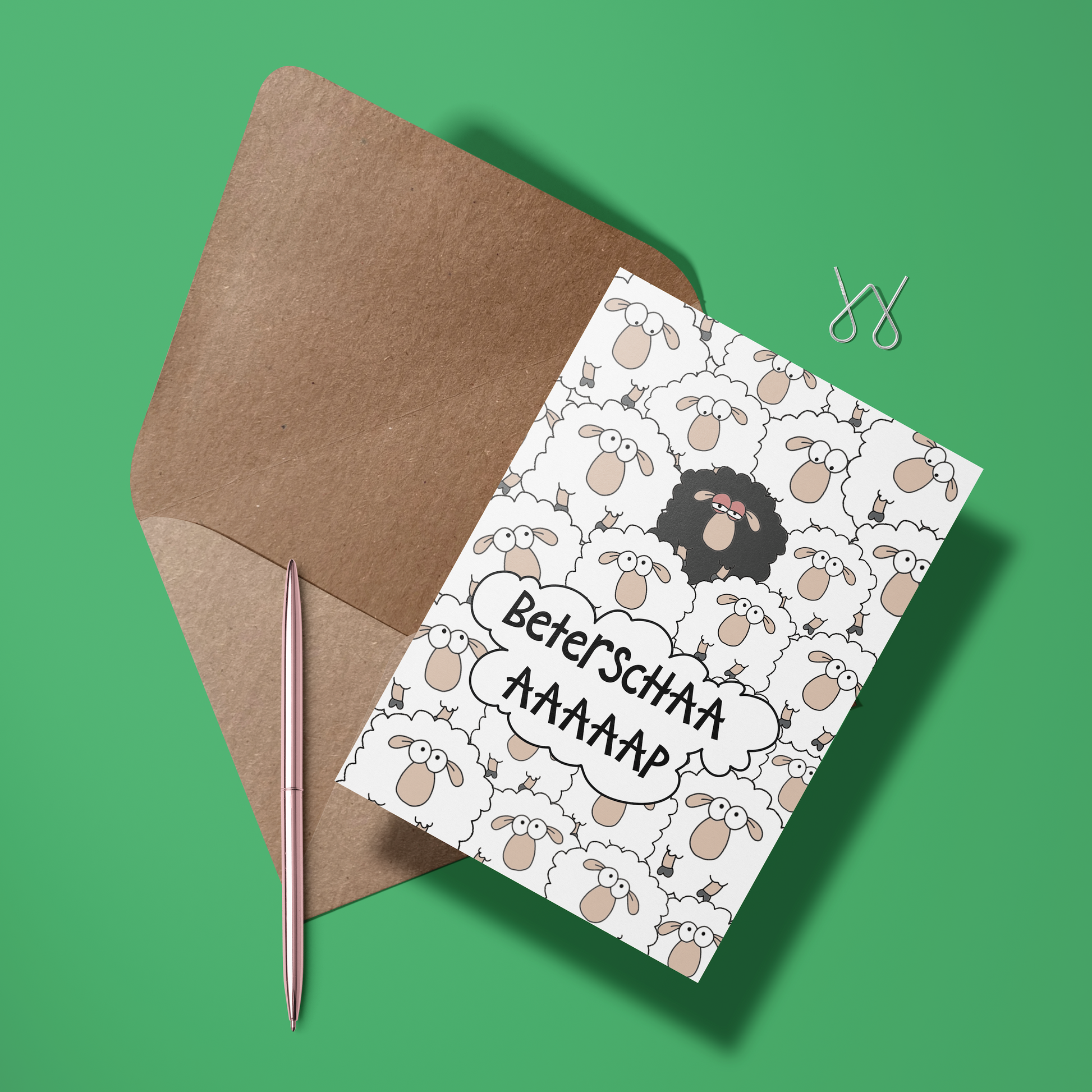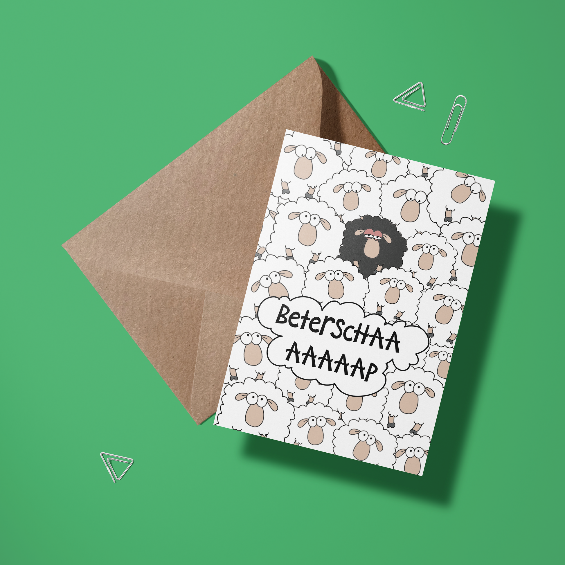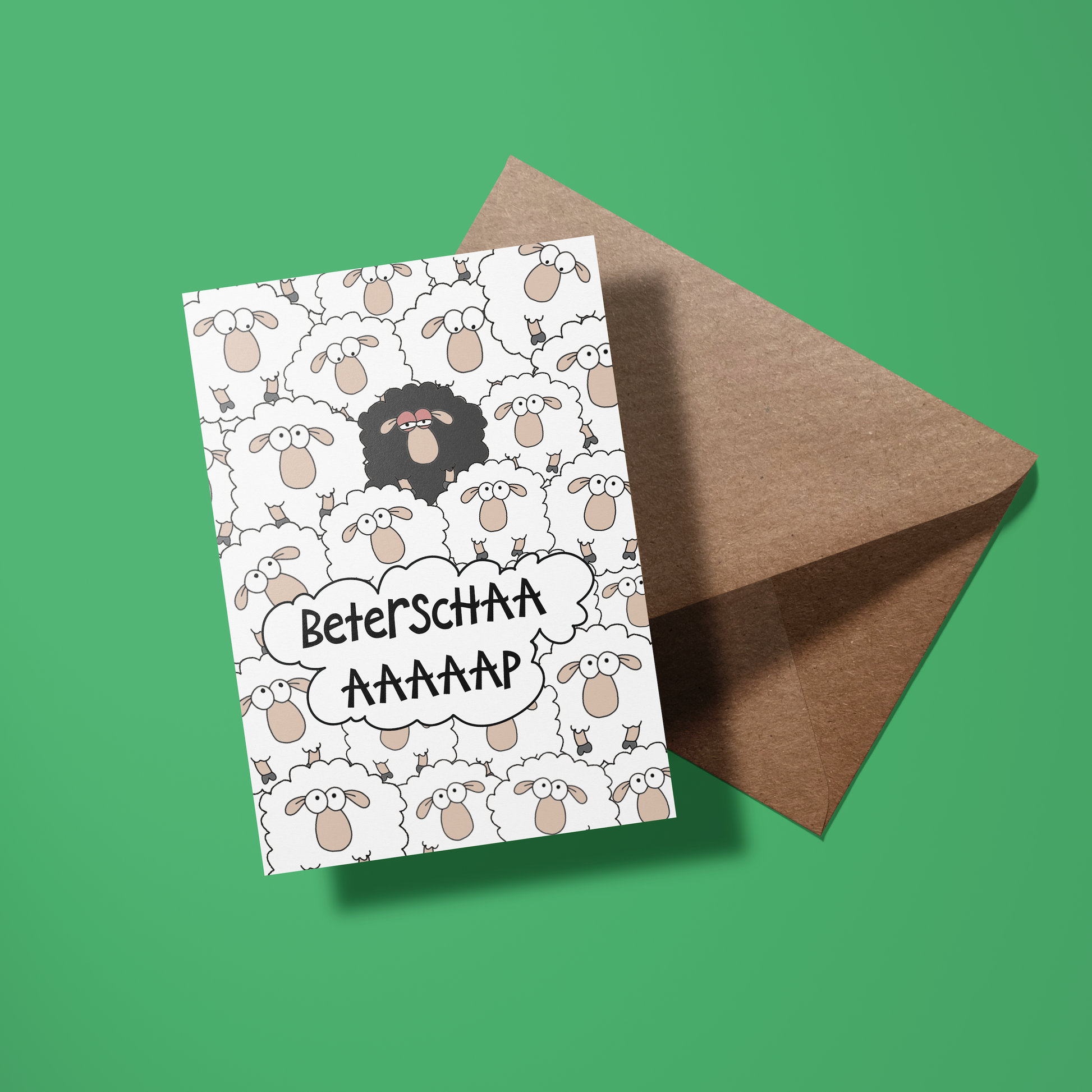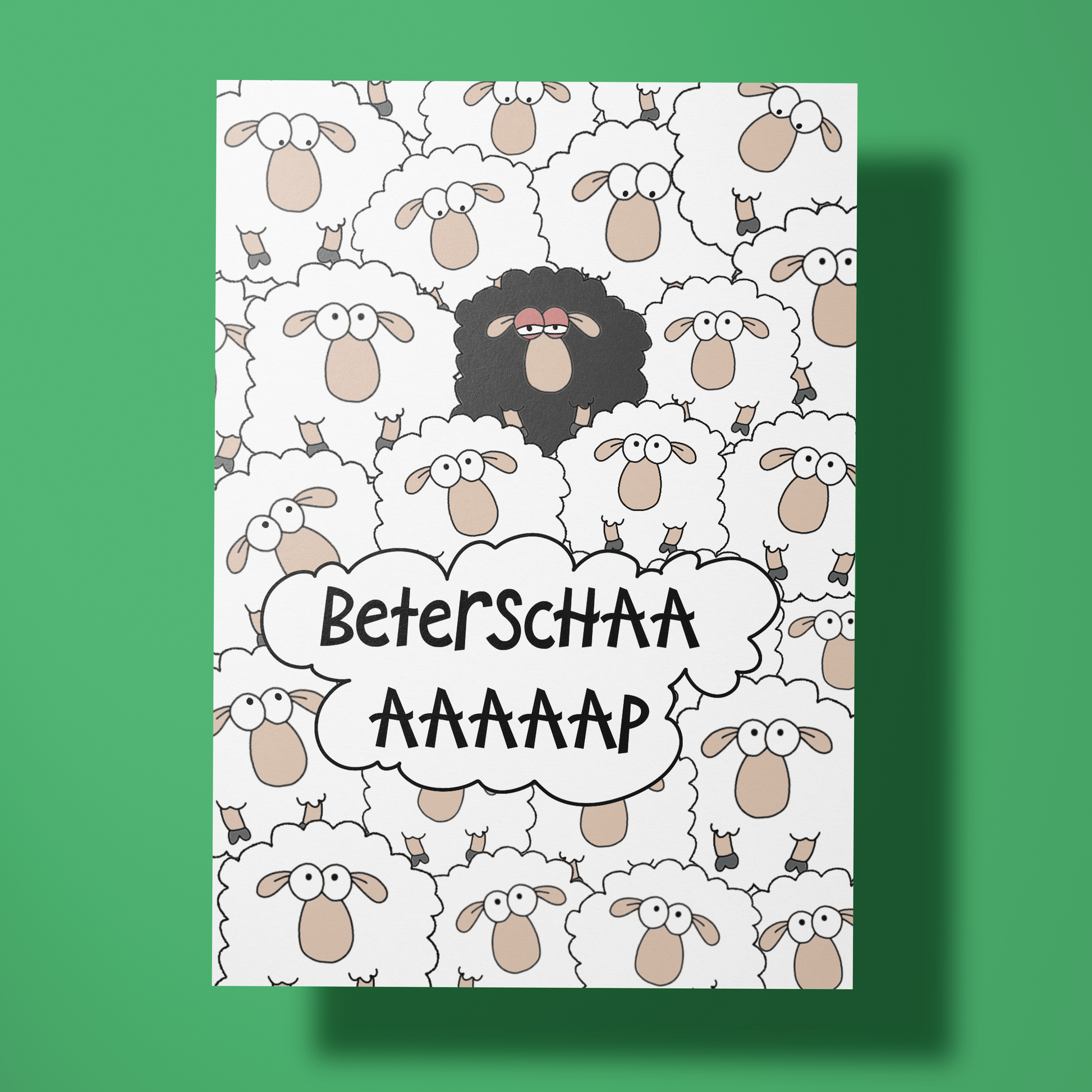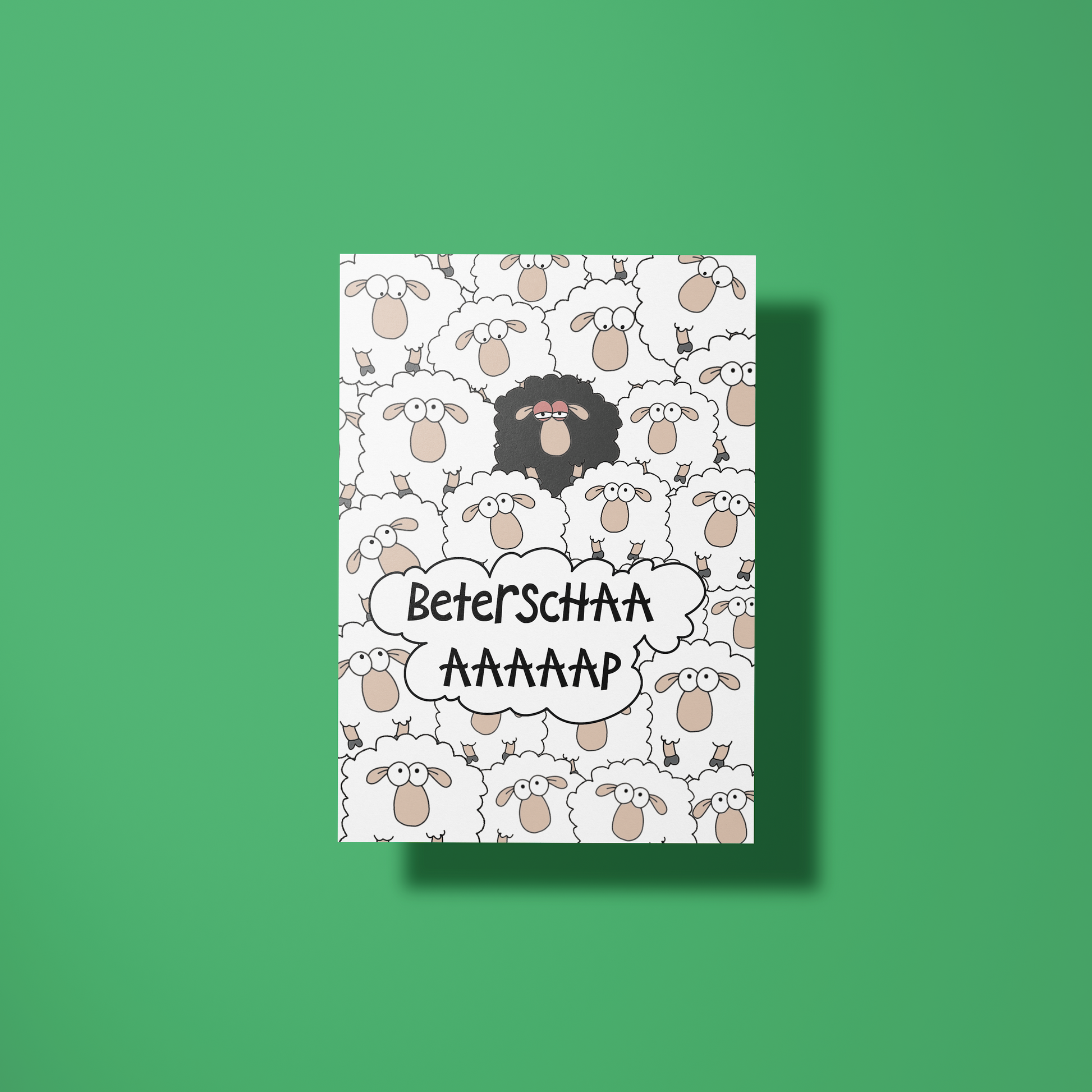 Stuur een wollige knuffel op papier met deze schattige en grappige beterschapskaart! De kaart toont een kudde witte schapen en één eigenwijs zwart schaap, met de speelse boodschap "Beterschaaap" – perfect voor een glimlach en een beetje extra steun tijdens het herstel. Het woordgrapje en het schapen-geluid zorgen gegarandeerd voor een lach, ook al voelt de ontvanger zich nog wat 'baaah'.